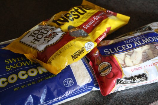 This is why I avoid such recipes. However, when I saw this recipe on Joy the Baker’s blog I couldn’t NOT make it. Chocolate, sliced almonds, and sweetened coconut? Hi, I’m in Heaven. I had to try it. And good news! It wasn’t too stressful! Sure, I had my doubts during the process (minor temperature situation) but this recipe took less than an hour to make (and less than an hour to eat). It turned out to be a relatively easy recipe and one I will definitely be making again.