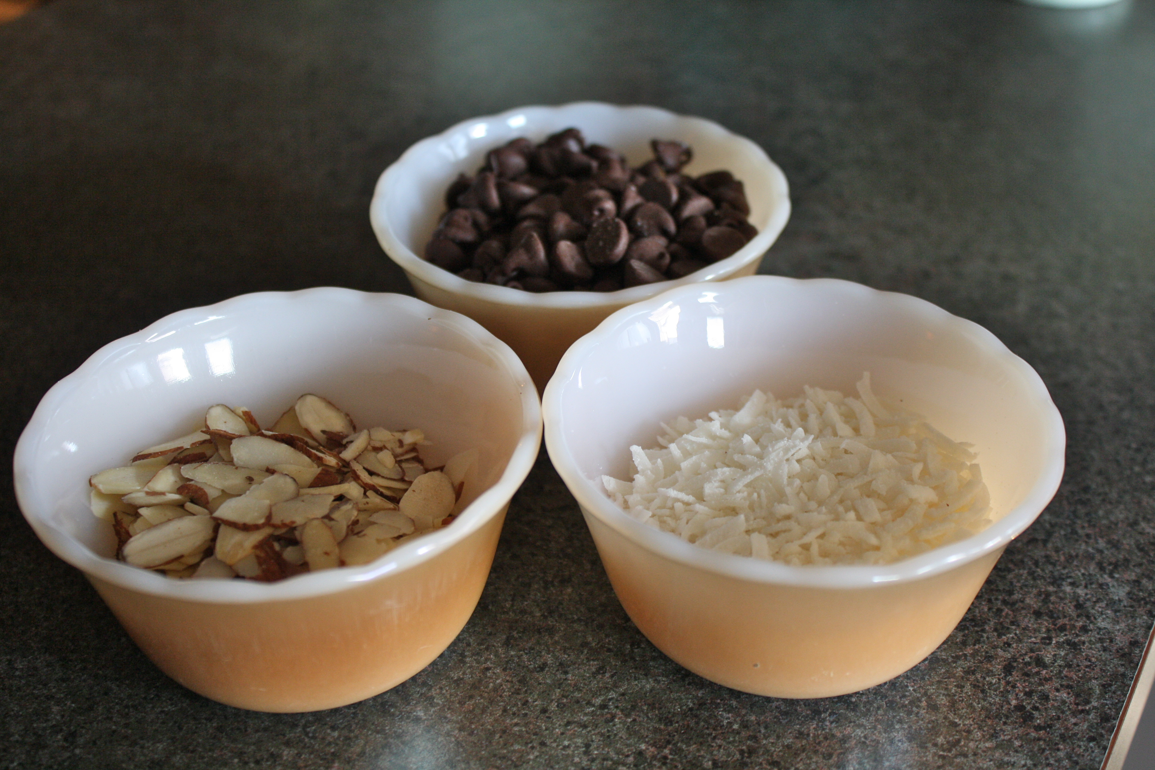 Cover two baking sheets with parchment paper and set aside. Place rack in the center of the oven and preheat the oven to 350 degrees. Mix together the coconut and almonds and place on an uncovered baking sheet. Toast in the oven for 8-10 minutes or until browned (watch the coconut! It browns quickly!). Set aside and allow to cool.