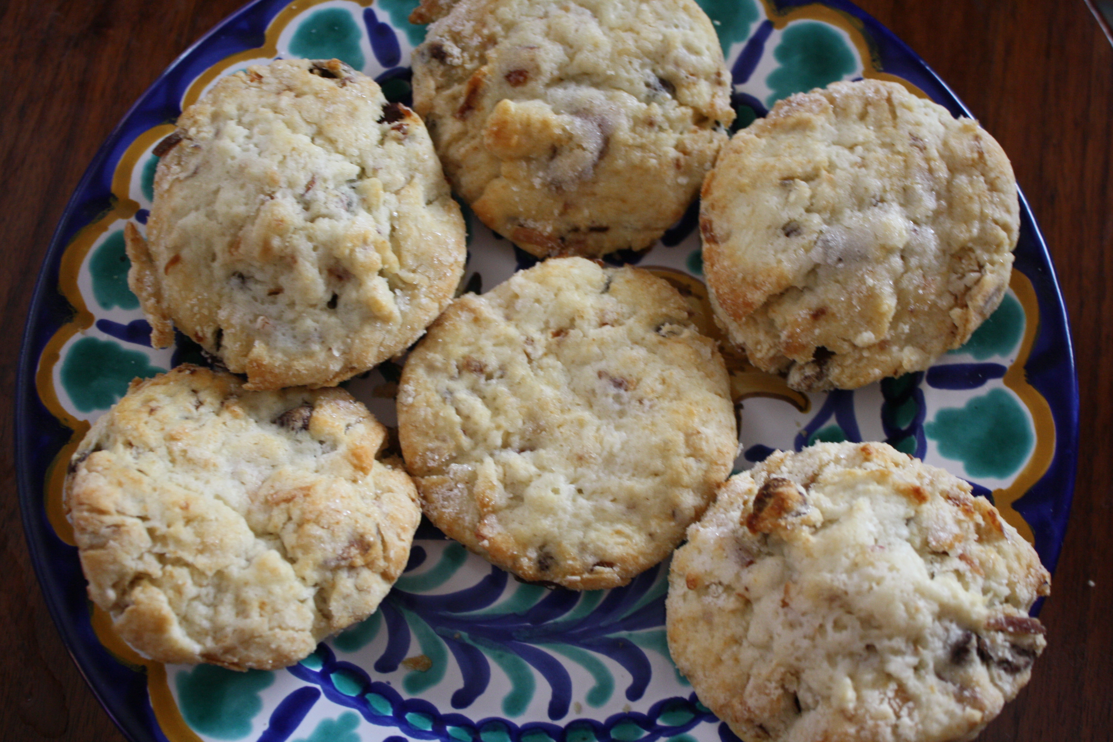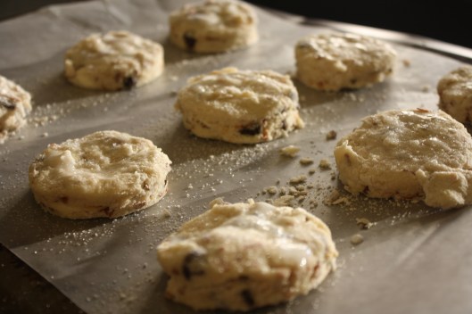 Whisk together the buttermilk and egg. Remove the bowl from the fridge and whisk in the almonds, coconut, and chocolate chips. Create a well in the center of the flour mixture. Add the buttermilk-egg mixture to the well in the center of the bowl. Using a fork, bring the dry ingredients to the wet ingredients. Continue until ingredients are well mixed. Flour a work surface and place the dough (it will be clumpy!) on it. Form a 1 1/2 inch disk with the dough using your hands. Using a biscuit cutter (I used a wine glass…), cut out the biscuits and place on the baking sheets about 1 inch apart*. Brush a little bit of buttermilk onto the biscuits then sprinkle with sugar. Bake for 14-18 minutes or until golden brown on top.
