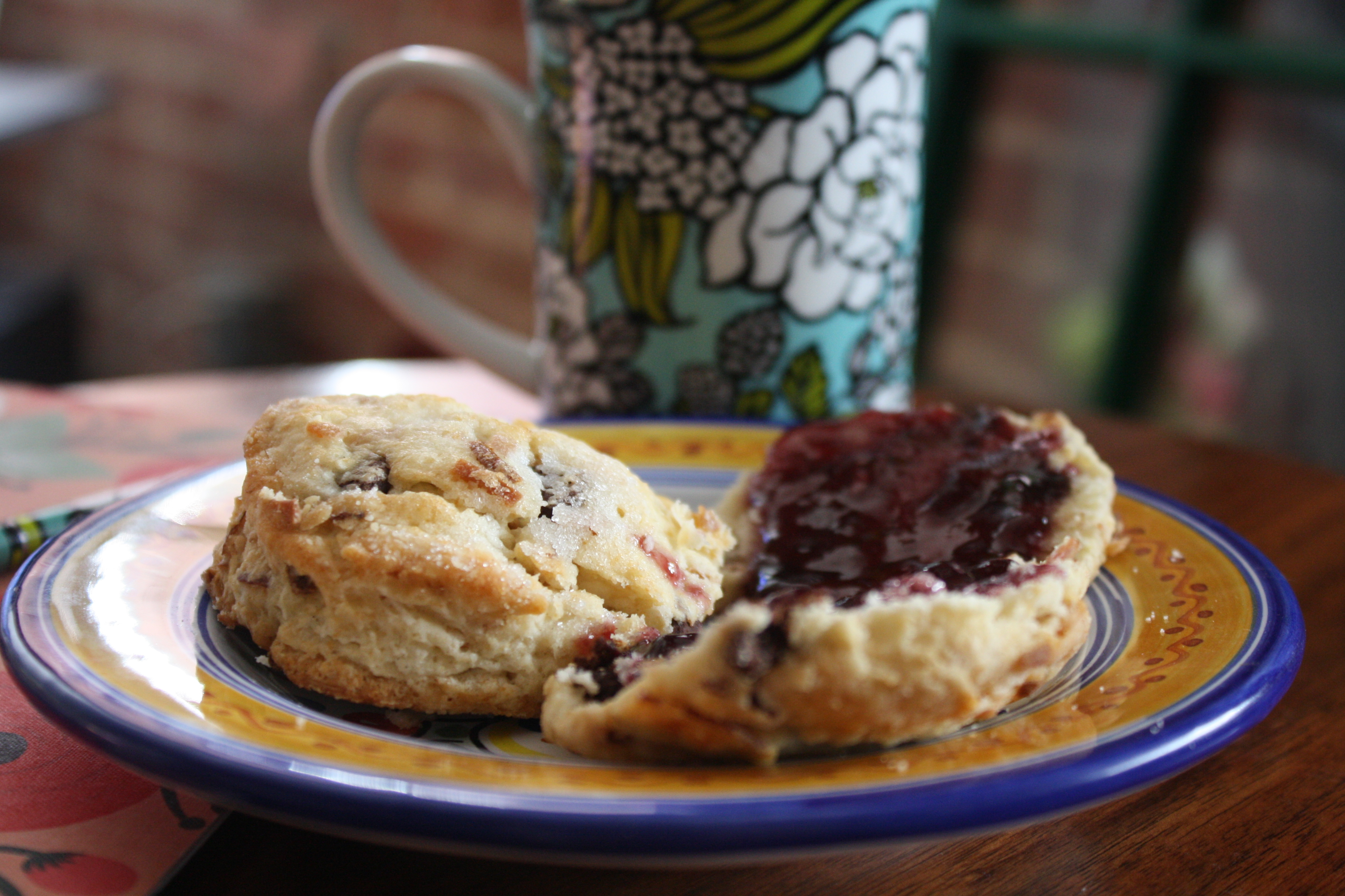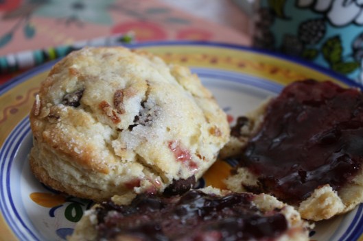 I HIGHLY suggest you make this recipe soon. The scones are the perfect start to a saturday morning with a cup of coffee. They aren’t too sweet so if you’re not into really sweet things, these are for you! I have a mighty strong sweet tooth so adding a bit of jelly or apple butter made them absolutely perfect. The chocolate chips provide a sweet touch to these biscuits and the almonds and coconut add amazing flavors. Doesn’t get much better than these.