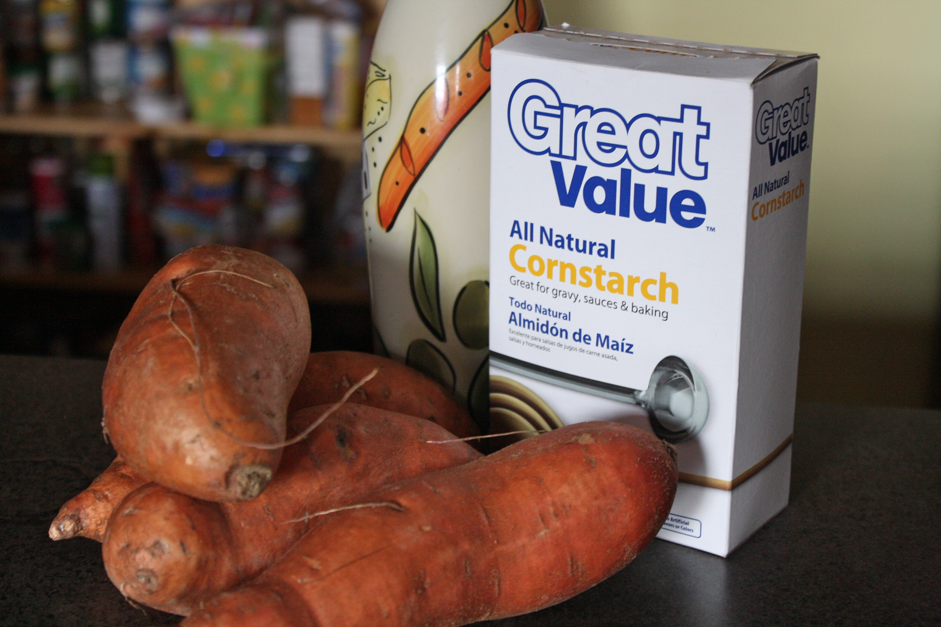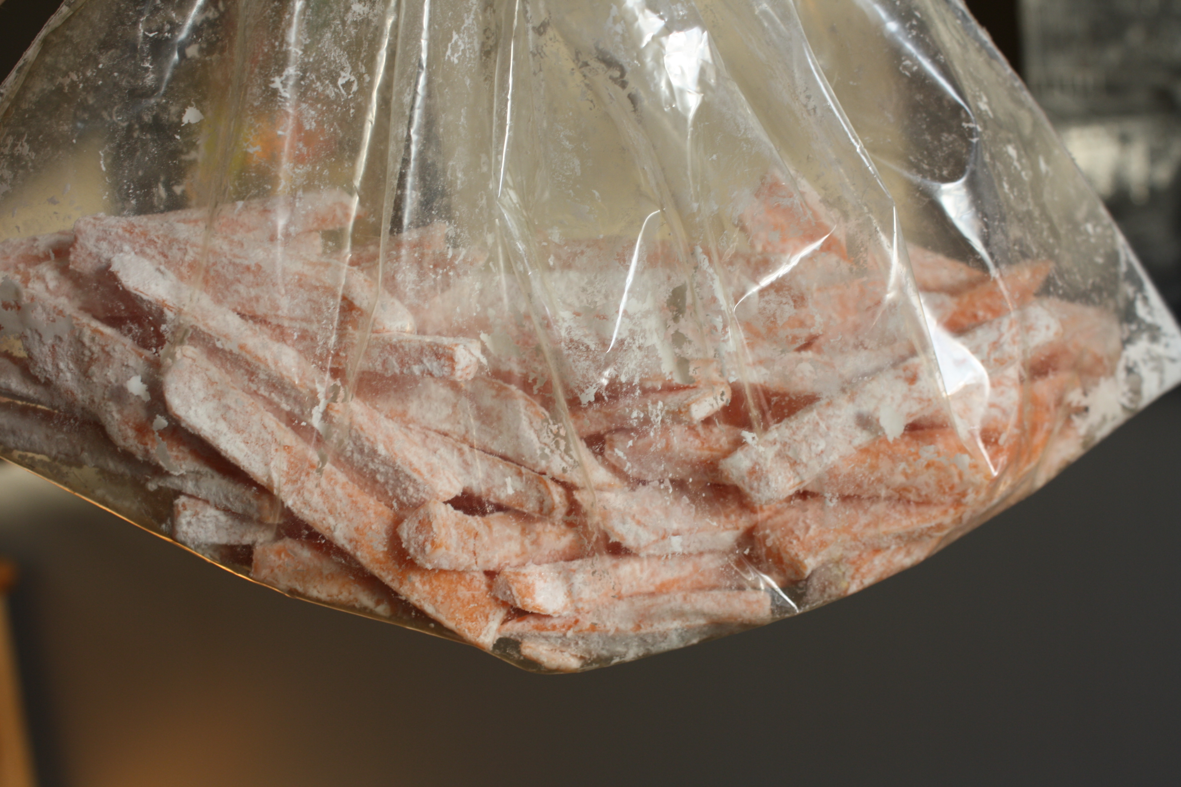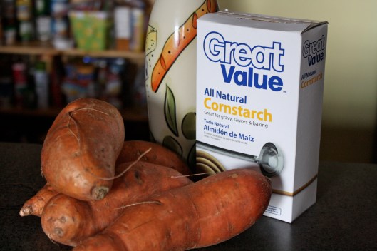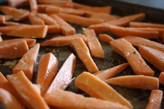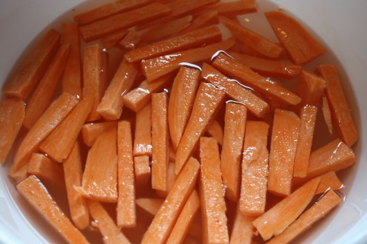 Peel sweet potatoes and cut them into medium thickness. Soak them in water for an hour to half the day. Preheat the oven to 425 degrees. Place the corn starch in a large bag and throw in a handful of the sliced sweet potatoes. Twist the bag at the top with air in the bottom, making a quasi-balloon. Shake the fries in the bag with the cornstarch, making sure they’re completely coated. Toss the fries onto a non-stick baking sheet. Drizzle ~ 2 tbsp. of olive oil on the fries and using your hands, mix the fries, making sure they’re all coated with the oil. Arrange the fries on the pan making sure they aren’t touching… don’t crowd the pan! Bake for 15 minutes then enjoy!