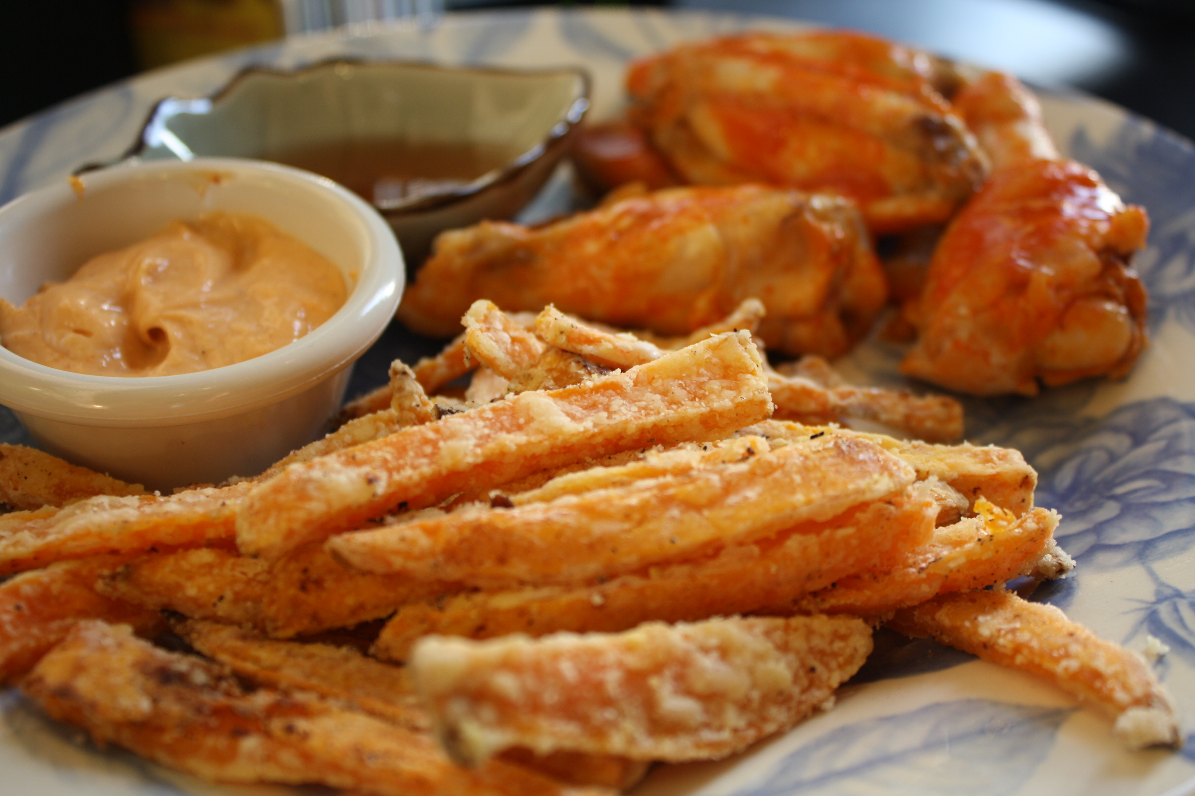 A great dipping sauce for the fries: mix together 1/2 cup mayonnaise, 1 tsp siracha, and 1/4 tsp cayenne pepper. Maple syrup is equally delicious!