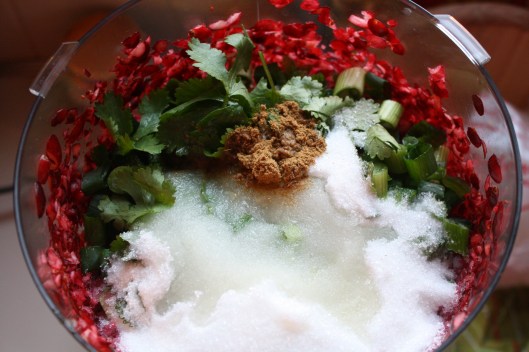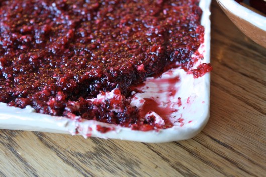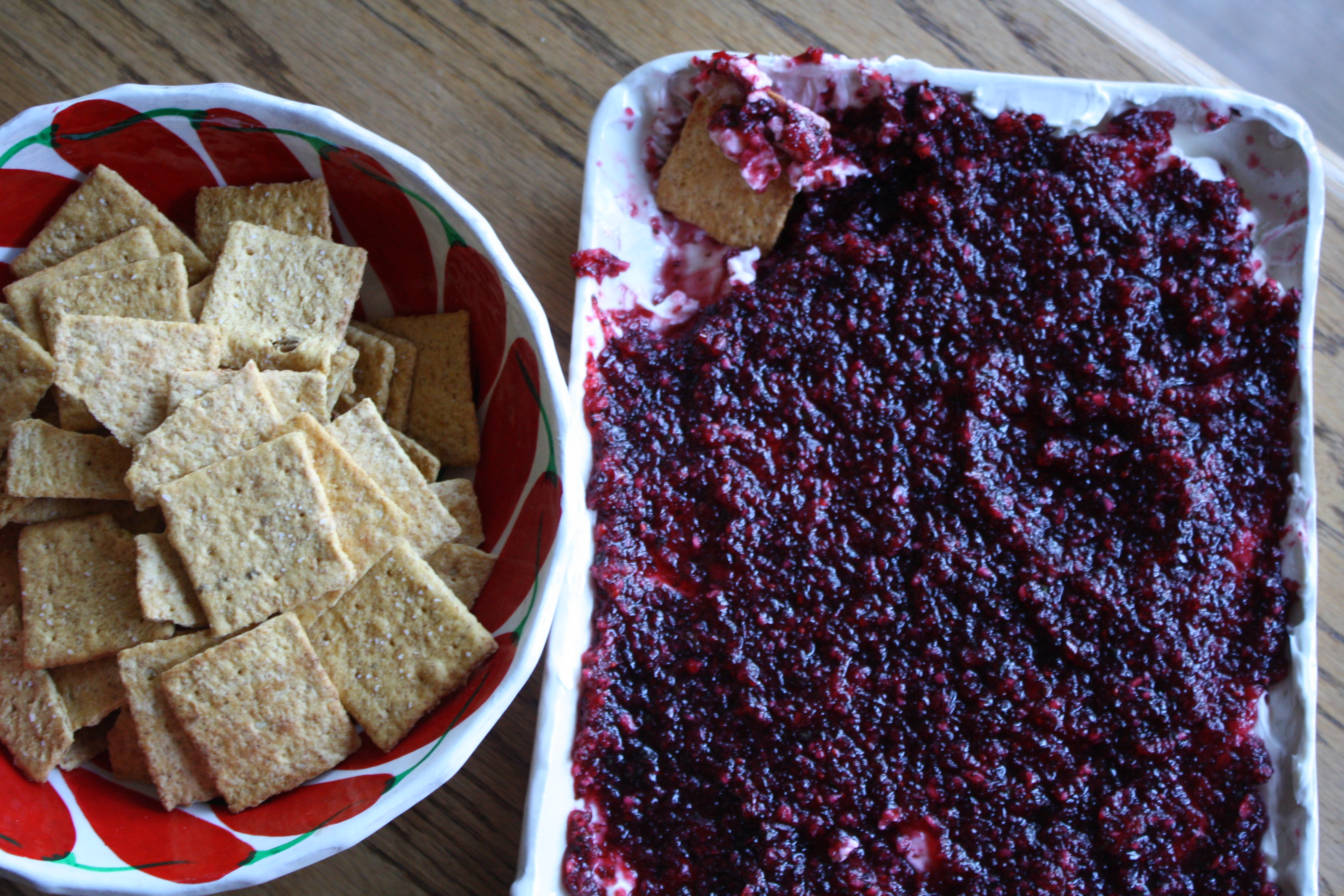 Pulse the cranberries in a food processor until coarsley chopped. Add the jalapeño pepper, onions, cilantro, sugar, cumin, lemon juice, and salt to the food processor. Pulse until well blended and finely chopped. Cover and place in the fridge for at least 4 hours (overnight is best). On the day you’re serving it, spread the cream cheese evenly on a dish or serving plate. Spread the cranberry mixture on top of the cream cheese and place in the fridge for an hour before serving. Serve with crackers (I used wheat thins) and enjoy!