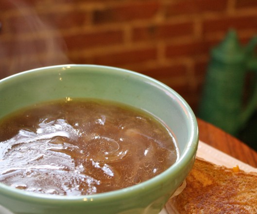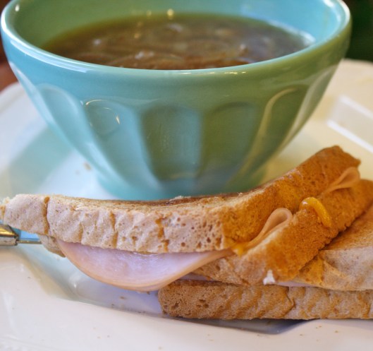 French onion soup is ALWAYS my go-to soup. It has been ever since I was little. My dad used to make french onion soup for week night meals, large crouton and broiled cheese included. I didn’t add the bread or cheese to this recipe but instead served it along side a hot ham and cheese sandwich. Both options are equally delicious.