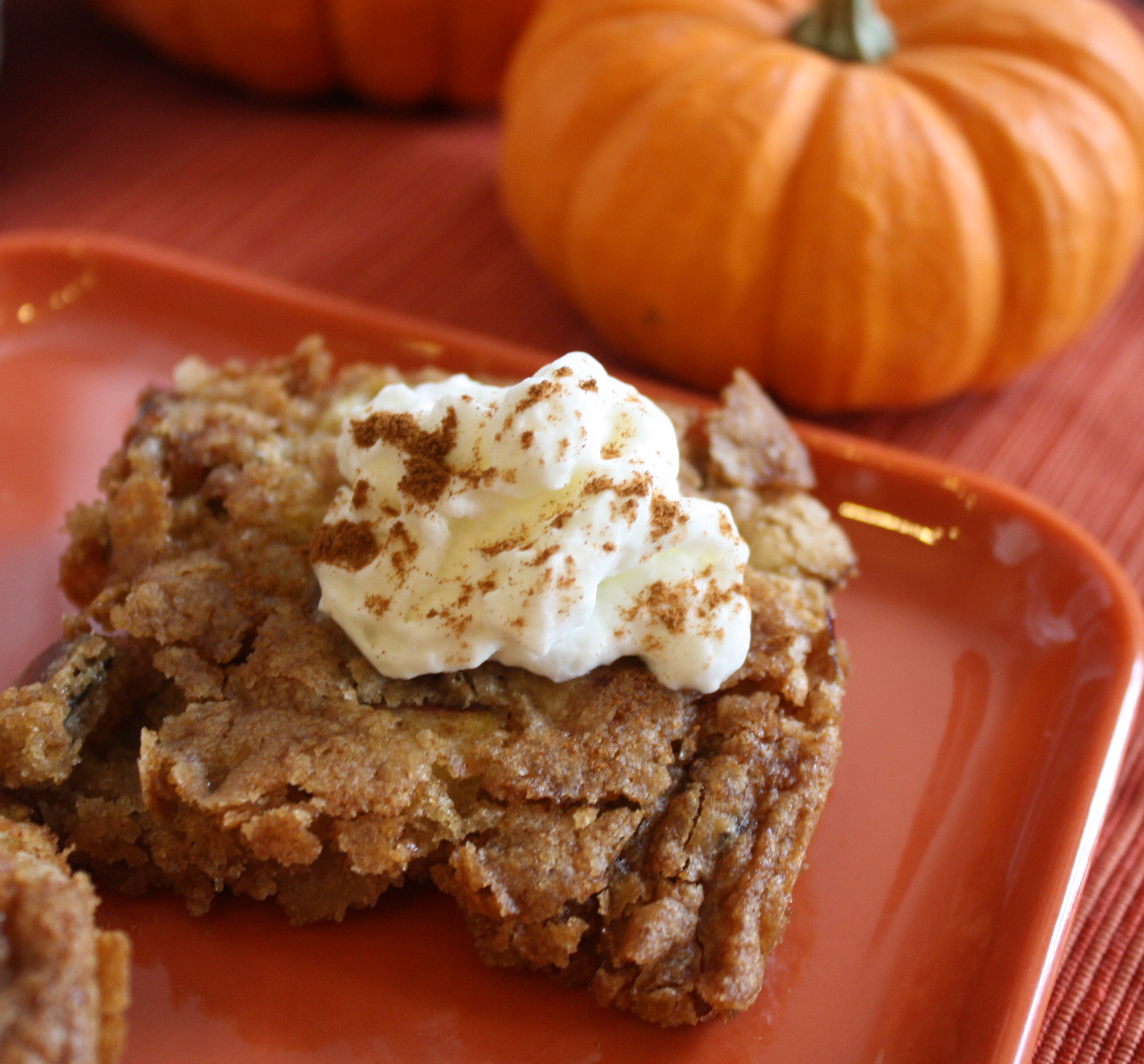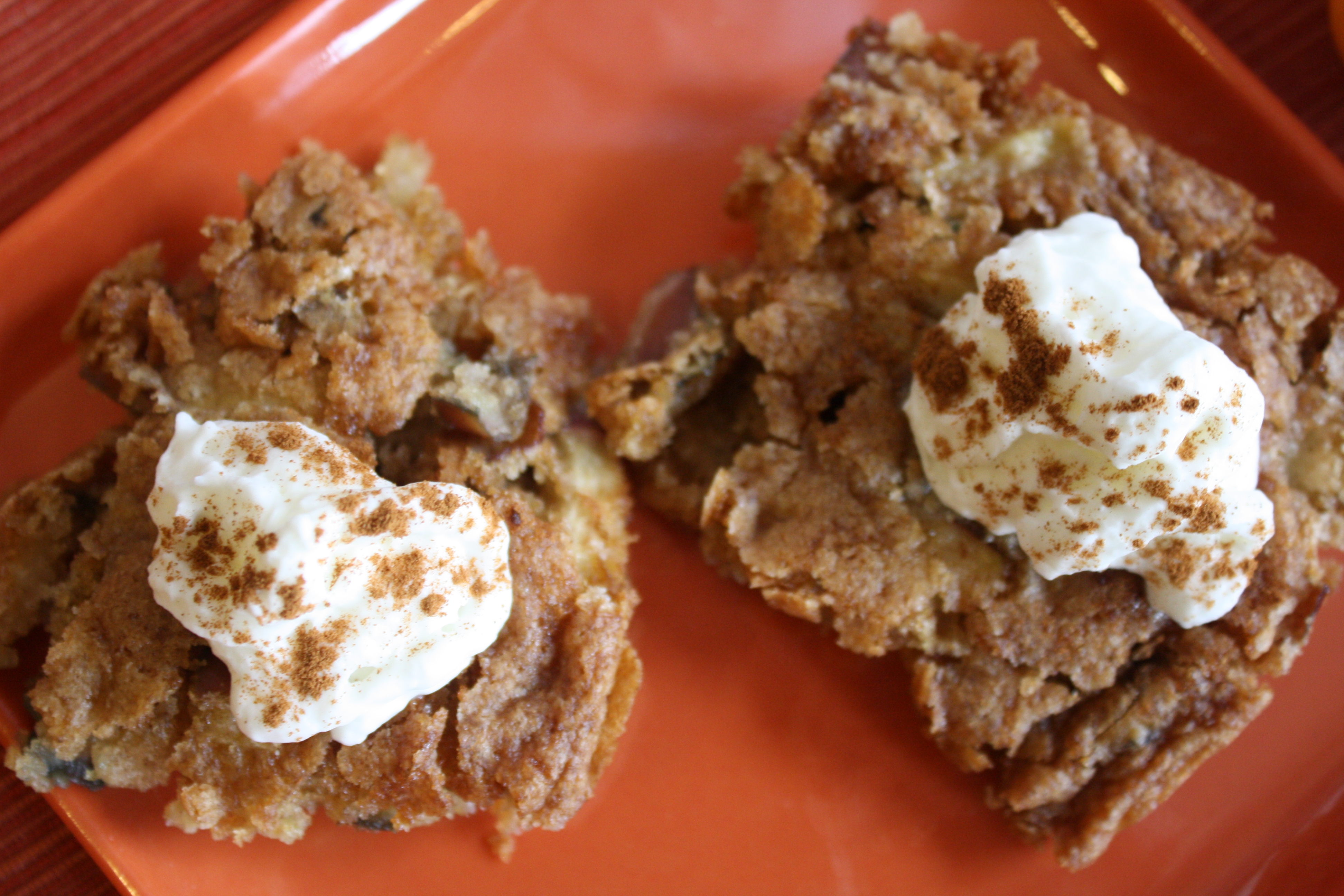 Preheat oven to 350 degrees. Butter an 8×11 baking dish (I used 9×13). Whisk together flour, cinnamon, baking powder, salt, and baking soda. Set aside.