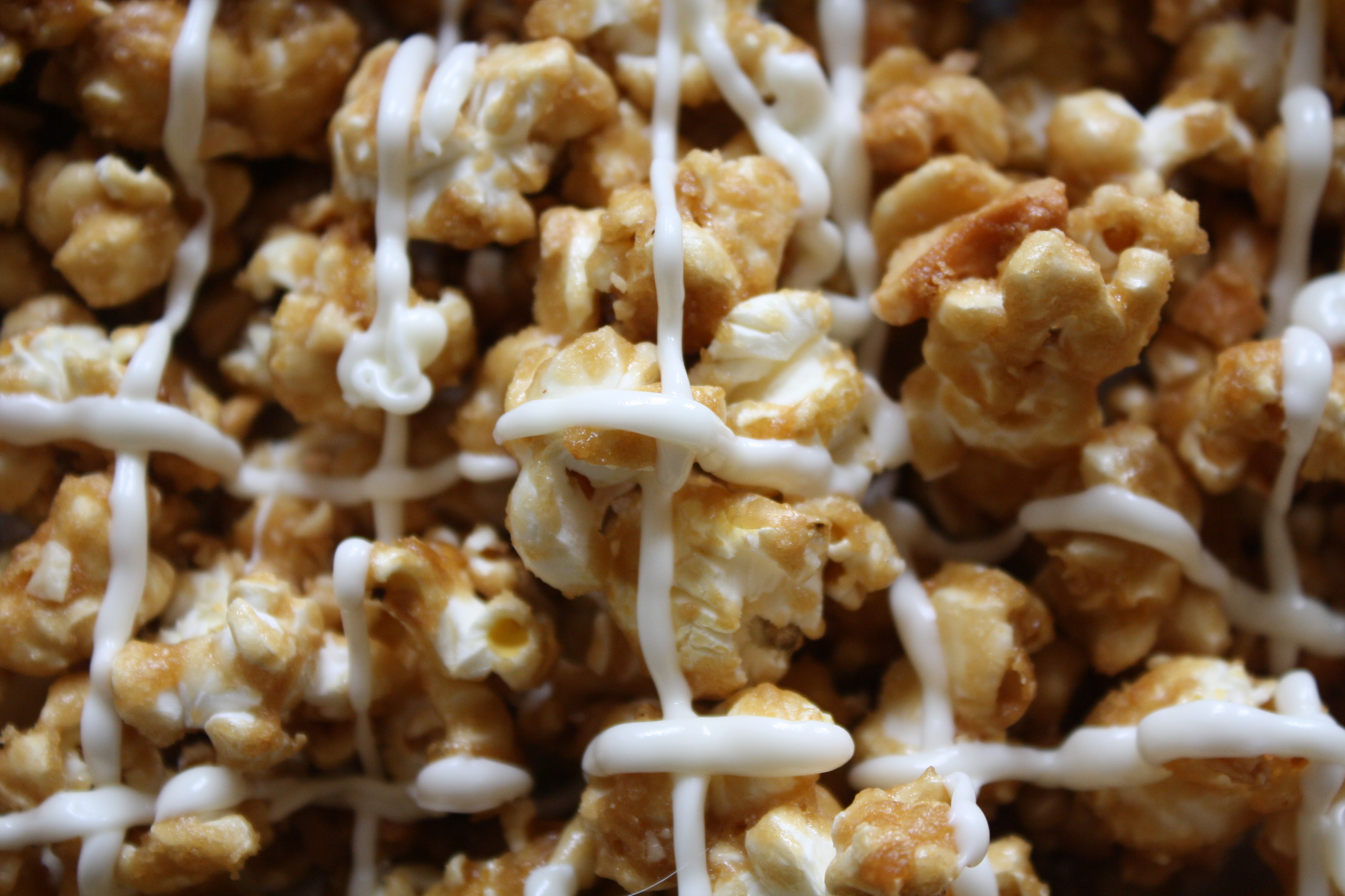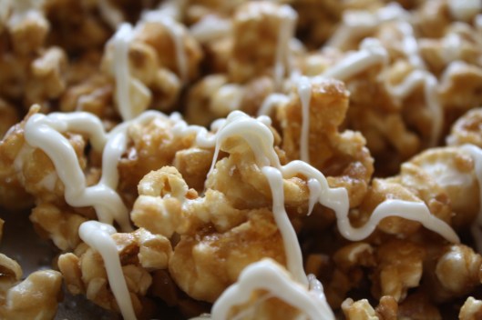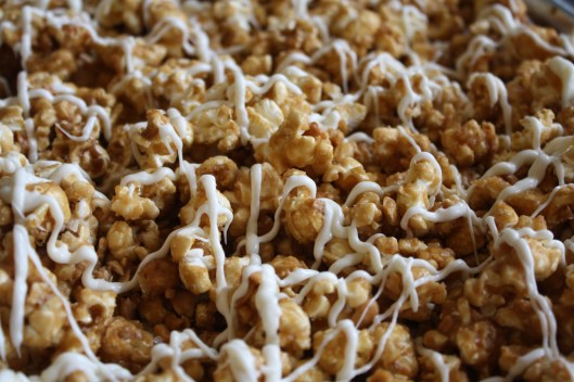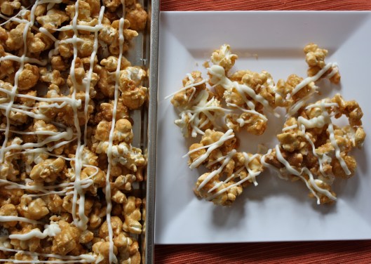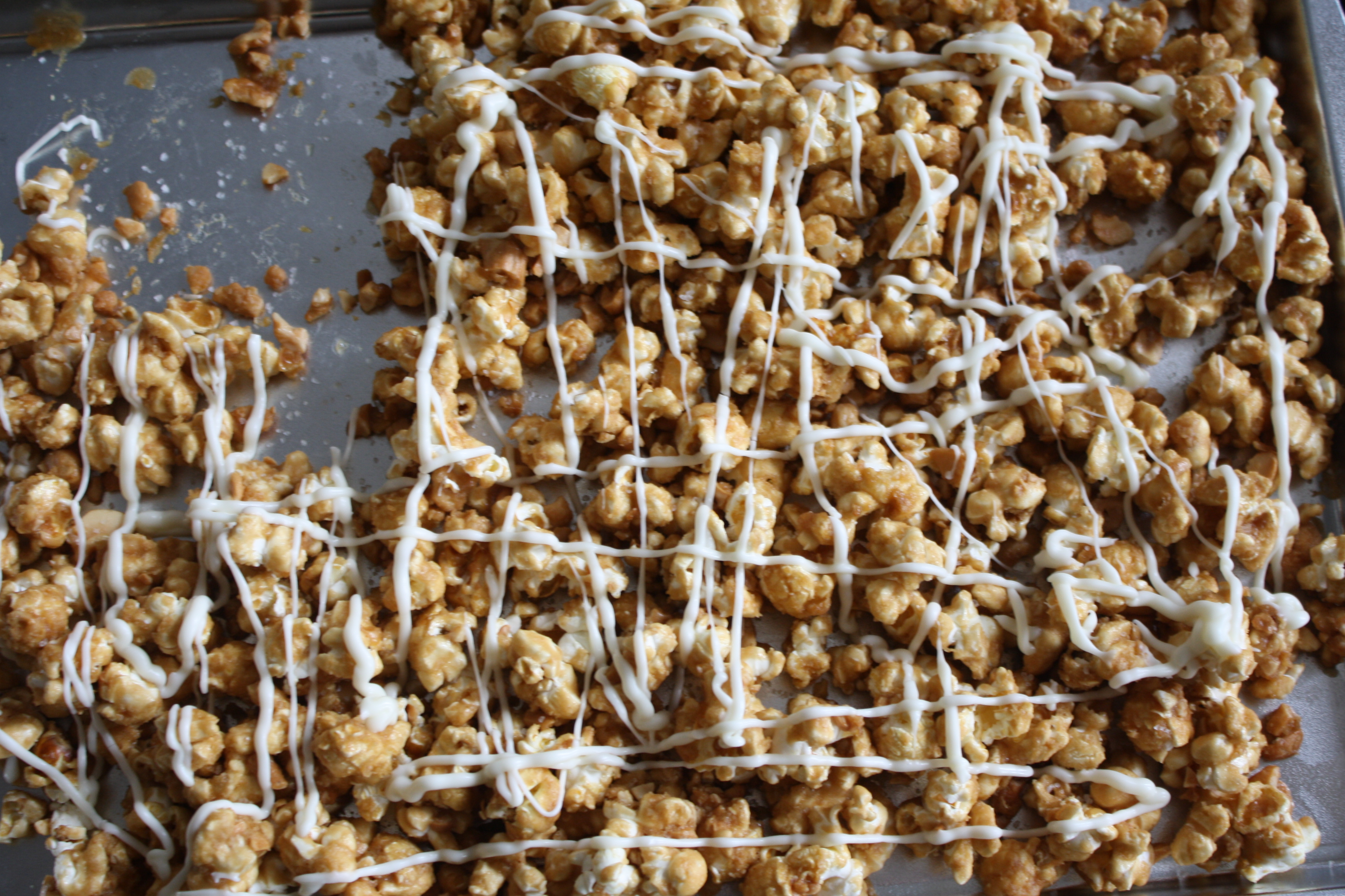 Once cooled, melt chocolate in microwave or in a sauce pan over boiling water. Add chocolate to a bag with a tiny cut in one of the corners. Twist the top and begin to drizzle the chocolate over the popcorn on the baking sheets. Place baking sheets in the fridge for 10 minutes for chocolate to set. Break apart into pieces and enjoy!