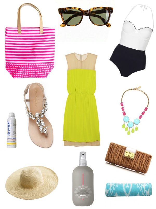 //Stripe &Dot Print Canvas Tote– LEIF// Cream Scallop Texture Swimsuit– Top Shop// Ray-Ban Meteor Sunglasses– J.Crew// Emily Necklace– Design Darling// Washed Silk and Chiffon Dress– Net-a-Porter// Sparkle Sandals– Lilikoi Design// Supergoop Antioxidant-Infused Sunscreen Mist with Vitamin C- Birchbox// Havana Clutch– J. Crew// Summer Straw Hat– J.Crew// Sea Salt Primer– Davines// Echo Design Beach Towel– Birchbox//