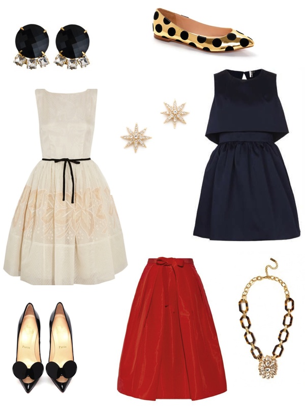 Bounkit- Black Onx Studs // Loeffler Randall- Quinnie Pointed Toe Flat // Valentino- White Emroidered Silk Dress // Elizabeth and James- Northern Star Stud Earrings // TopShop- Duchess Satin Skater Dress // TIBI- Pleated Silk Faille Skirt // Christian Louboutin- Madame Mouse Black Patent Leather Pumps // BaubleBar- Tortoise Byzantine Crystal Pendant Necklace