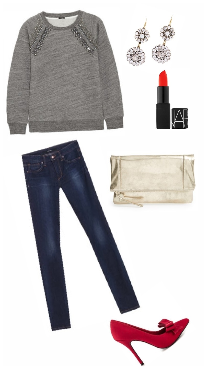 Good Afternoon! Today, as I was sitting around thinking about what to wear to a holiday party this weekend, I started looking at typical holiday wear you see in movies, ads, and blogs. Um. If I wore a cocktail dress to my work party, I would never hear the end of it. Let’s face it. Most holiday soirees are fairly casual. So what to wear? Here’s what I’m thinking: